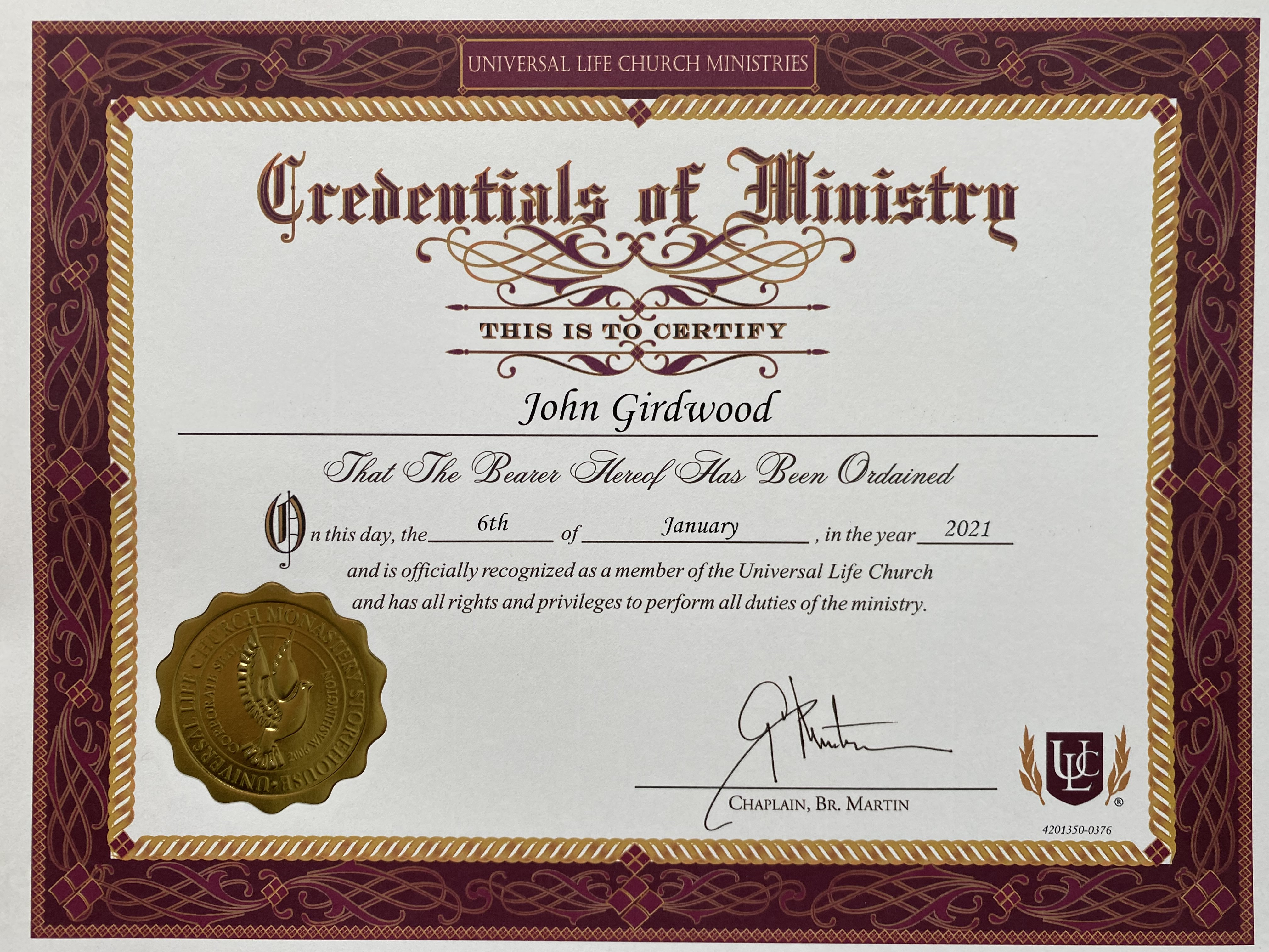 I was ordained through the Universal Life Church, based in Modesto, California.